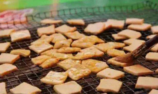 The beancurd is cut three cm long and 0.5 cm thick, then baked on a barbed wire above a sawdust-burning brazier after being soaked in marinade. When it gets brown, it is cut from the side and garnished with ingredients, including cilantro, cayenne pepper, diced spring onion, soy sauce and vinegar.