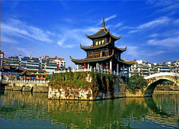 The Jiaxiu Tower, built in the Ming Dynasty (1368-1644), stands over the Nanming River in the center of Guiyang, capital of Guizhou province. [Photo provided to chinadaily.com.cn]