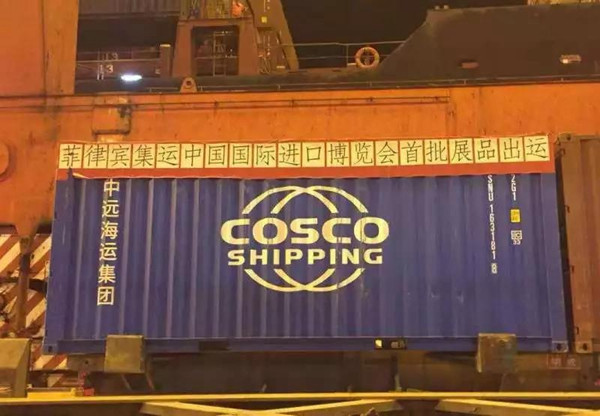 The first batch of exhibits from Philippines for the CIIE, shipped by China COSCO Shipping Corporation Limited, arrived in Shanghai on Oct 3, and then was successfully break bulked at the company on Oct 4, completing its first operation of the international shipping service.
