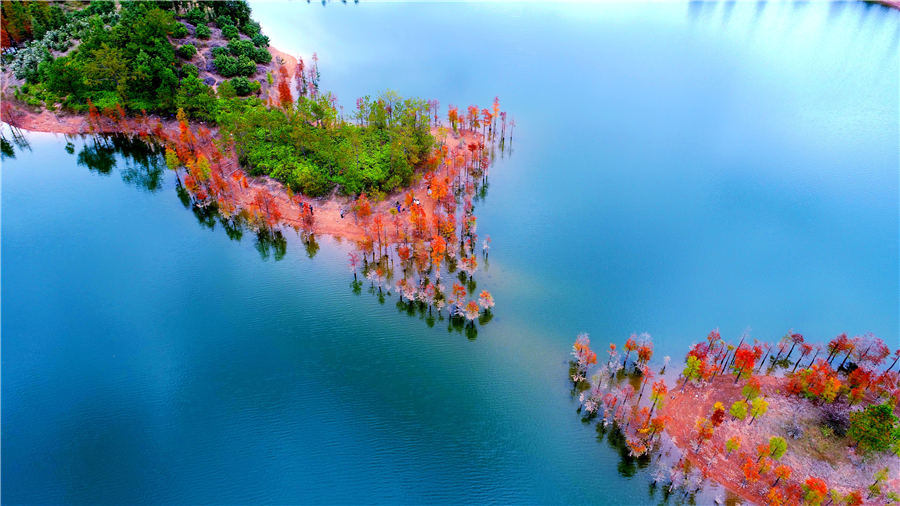 An aerial view of the colorful redwood forest at Zhengqiao Reservoir in Xianju county, East China's Zhejiang province, on Nov 4, 2018. [Photo by Wang Huabin/Asianewsphoto]