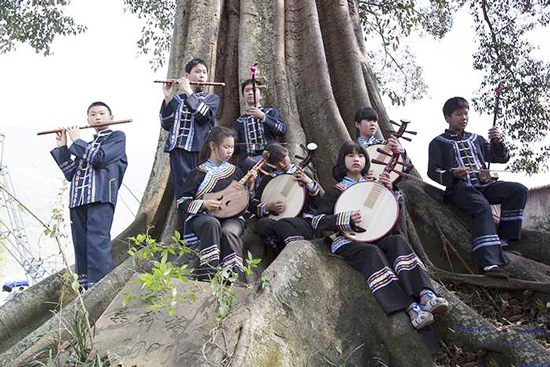 Eight Bouyei villagers in blue and white cloth gowns play traditional Buyi instruments such as Niuguhu, Niujiaohu, Huluqin, Bamboo Flute, Yueqin, Leyou, Cigu and small cymbals, narrating the twelve sections of Bouyei wedding customs with twelve different tunes, including meeting, setting out on a journey, blocking the way, drinking the bamboo wine, wedding lamentation and sending the families. The melody is simple and smooth and resembles the sounds of nature.