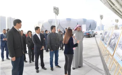 Sheikh Ahmad al-Fahad al-Sabah, president of the Olympic Council of Asia, inspects the soon-be-completed Hangzhou Olympic Sports Center, the main venue for the 2022 Asian Games in Hangzhou, Zhejiang province, on Nov 22. [Photo/zjol.com.cn]