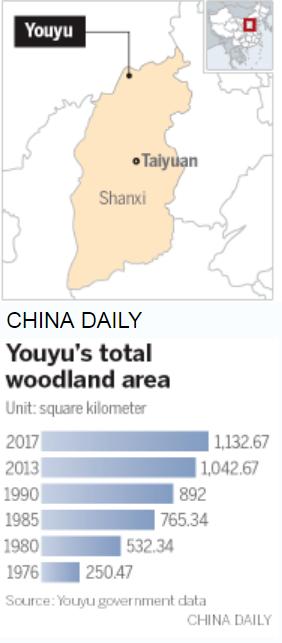 The woodland area of Youyu has increased from 250 sq km just before the launch of reform and opening-up to about 1,100 sq km, and now covers 54 percent of the county.