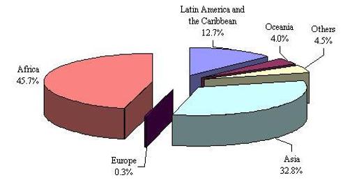 The geographical distribution of China’s foreign aid shows a comparatively even coverage. The recipients cover most developing countries in Asia, Africa, Latin America, the Caribbean, Oceania and Eastern Europe. About two-thirds of China’s aid always go to the least developed countries and other low-income countries. By the end of 2009, China had aided 161 countries and more than 30 international and regional organizations, including 123 developing countries that receive aid from China regularly. Of them, 30 are in Asia, 51 in Africa, 18 in Latin America and the Caribbean, 12 in Oceania and 12 in Eastern Europe. Asia and Africa, home to the largest poor population, have got about 80% of China’s foreign aid.