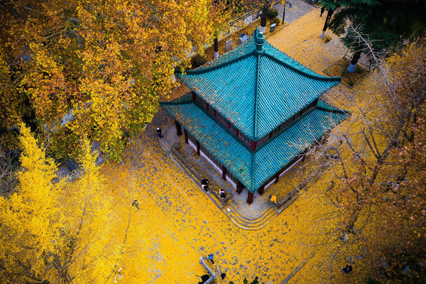 Golden ginkgo leaves cover the grounds at the Xuanwuhu scenic area in Nanjing city, Jiangsu province, Dec 1, 2018. [Photo by Su Yang/Asianewsphoto]