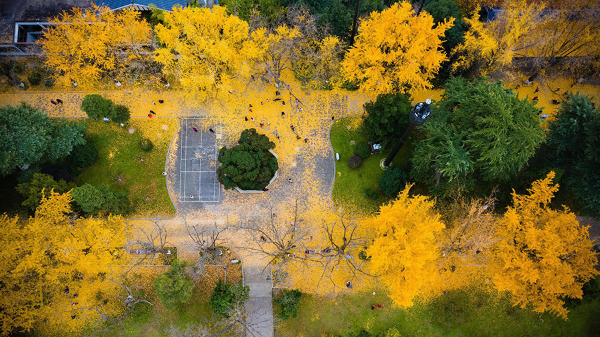 Golden ginkgo leaves cover the grounds at the Xuanwuhu scenic area in Nanjing city, Jiangsu province, Dec 1, 2018. [Photo by Su Yang/Asianewsphoto]