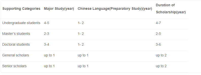 Chinese Government Scholarship covers both major study and Chinese language (preparatory) study. The table below illustrates the duration of each program.