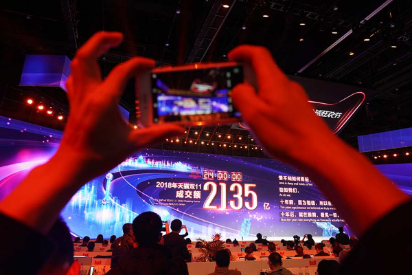 A screen in Shanghai shows sales on Alibaba's online marketplace Tmall reaching 213.5 billion yuan during this year's Singles Day shopping spree. [Photo by Gao Erqiang/China Daily]