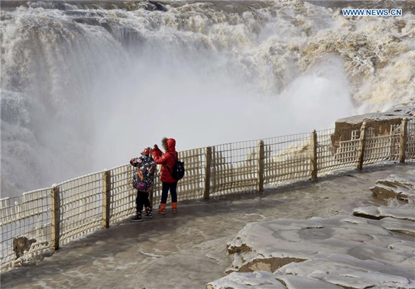 Visitors take photos of icicles at the Hukou Waterfall scenic spot of the Yellow River at the border area between north China's Shanxi province and northwest China's Shaanxi province on Dec 7, 2018. [Photo/Xinhua]