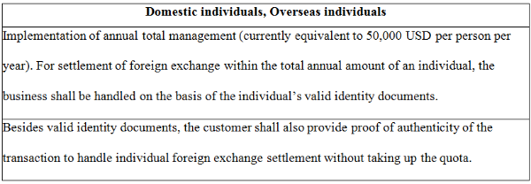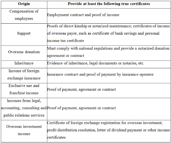 The origin of foreign currency banknotes should be verified when an individual settles a large amount of foreign exchange. If the accumulated value for any given day is less than $5,000 (inclusive), it can be handled directly at the bank. If the accumulated value of any given day is more than $5000, proof of origin of the foreign currency banknotes shall be provided.