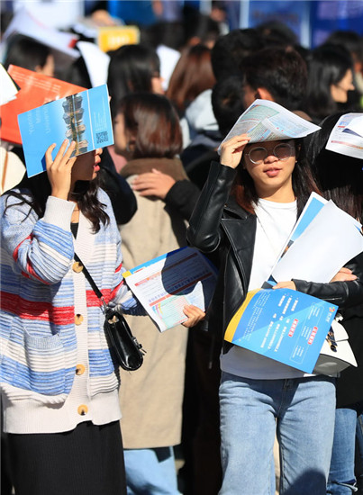 Graduates attend a career fair at Yunnan Minzu University in Kunming, Yunnan province, last month. More than 5,000 positions were being offered. [Photo by HAO YAXIN/FOR CHINA DAILY]