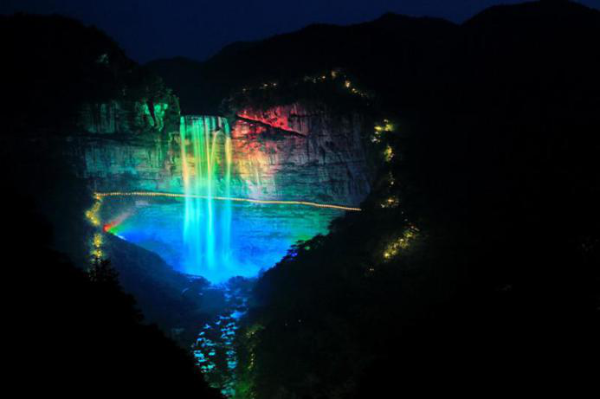 A night view of Wangxiang Stand Waterfall, one of the most popular natural landscapes decorated by modern technologies, in Simian Mountain Scenic Area [Photo/smslyw.com]