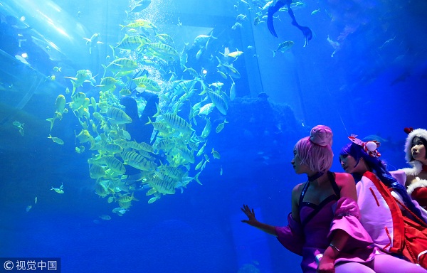 Visitors watch the ornamental fishes in the aquarium. [Photo/VCG]