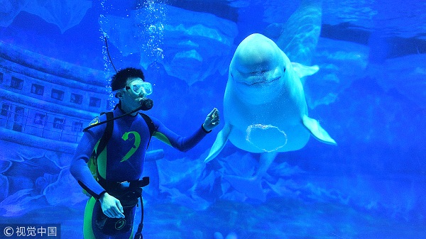 Polar Region Marine Animals World has various marine and polar animals. People can not only see rare polar animals like beluga whales, sea otters and sea elephants but also other animals like cute dolphins, lovely penguins and polar bears. In the 2,000 seat performance hall of the Aquarium, these animal stars give brilliant performances every day such as the gentle beluga kissing people and the dolphins' exuberant acrobatic display.