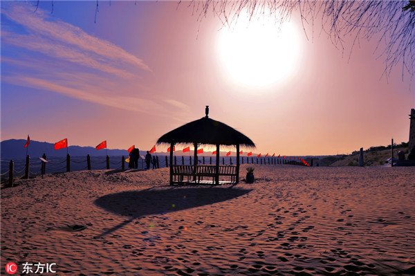 Shapotou scenic zone, 16 kilometers west of Zhongwei county in the northwestern Ningxia Hui autonomous region, has become a must-see for tourists who visit Ningxia. Wang Wei, one of the most well-known Chinese poets of the Tang Dynasty (618-907), recorded the beauty of Shapotou in a poem in which he talked about how "in the vast desert rises straight, lonely smoke, the grand, long river reflects the round setting sun".