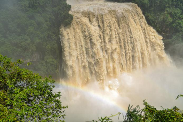 The spectacular waterfall is 77.8 meters high and 101 meters wide. Situated over the Baishui River in the Buyi and Miao ethnic groups' autonomous county, it is part of a karst landform and was named after the Huangguo tree, a special plant species found in the region. Behind it is a 134-meter-long water-curtain cave, which allows tourists to go inside, touch the waterfall and even see a rainbow arching across the fall on a sunny day.