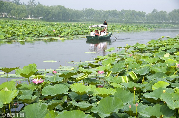 Visitors float on the Baiyangdian Lake to view lotus flowers in An’xin county, Baoding, Hebei province. [Photo/VCG]