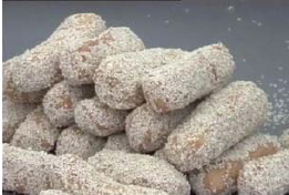 Liaohua candy is in a drum-stick shape. On its surface a layer of white sesame seed is spread; while the honeycomb candy in its heart is soft, sweet, crispy and fragrant.