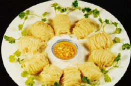Crispy fried noodle is a famous traditional snack from ancient Xi’an. It is characterized by multiple layers and very thin lines of soft and not greasy noodles. It gained its name from its special shape, “like a golden line when picked up and like a pine tower when put down.”