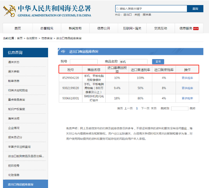 For example, if you want to know the tariff rate of mobile phones, you can enter the product name "手机" and click "Query" to get the results.