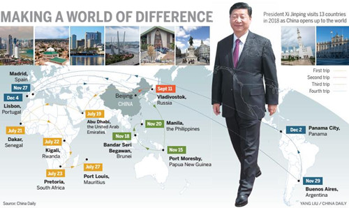 During his four overseas trips to 13 countries this year, Xi also called for joint efforts with other nations to maintain free trade, promote facilitation of trade and investment, and oppose protectionism.