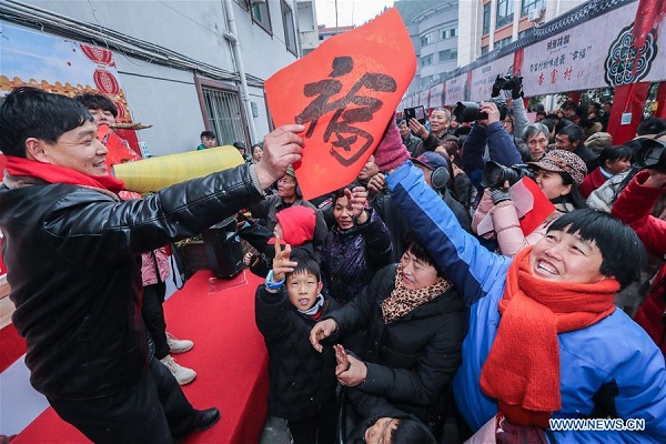 A villager receives a Chinese character "Fu", which means good luck, writen on a red diamond-shaped piece of paper in Zitong town of Chun'an county, Hangzhou city, East China's Zhejiang province, Dec 30, 2018. Zitong, a town locally known for its tradition in Chinese painting and calligraphy, held activities on Sunday to celebrate the new year. [Photo/Xinhua]