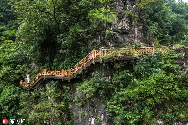 Wooden plank walkway winds along a wooded hill over the valley. [Photo/IC]