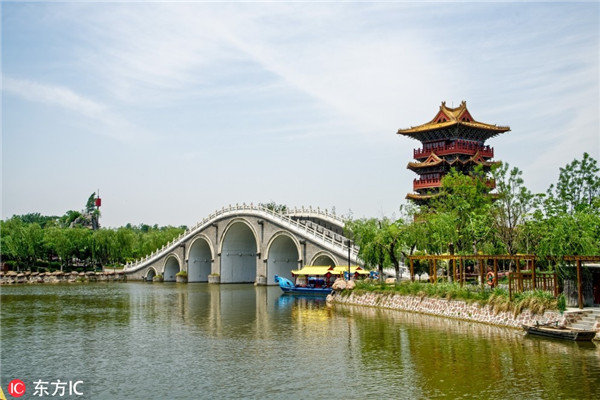 It boasts numerous wonderful scenic spots, including the Rainbow Bridge, a Wall painting of Qingming Festival by the Riverside, and the Kissing Cloud Pavilion, all of which are full of Song elements. The Rainbow Bridge, a splendid wooden arch bridge that crosses the Bianhe River, which flows through Bianliang, the capital city of the dynasty and today's Kaifeng, is considered one of China’s ten famous ancient bridges. The Kissing Cloud Pavilion, “fuyun” in Chinese, meaning touching the clouds, is the tallest building in the park.