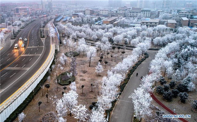 Photo taken on Jan 12, 2019 shows the rime scenery in Yuncheng city, North China's Shanxi province. [Photo/Xinhua]