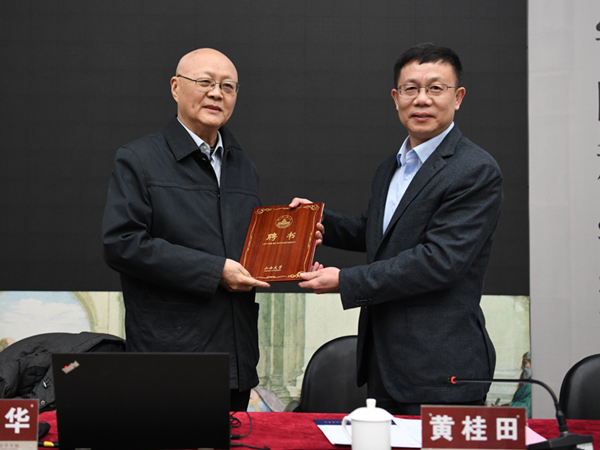 Zhao Dunhua (left) receives his letter of appointment from Huang Guitian, president of Shanxi University, Jan 8. [Photo/sxu.edu.cn]