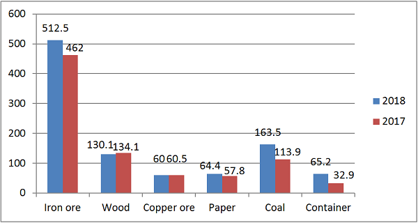 Major imports in Jan-Nov 2018 through the railway port compared to the same period in 2017 (10,000 tons/unit)