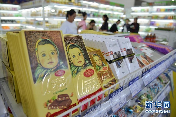 Visitors and local residents select Russian items at the China-Russia border market in Manzhouli, Sept 3, 2018. [Photo/Xinhua]