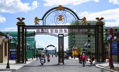 Tourists and local residents pass through the entrance gate of the China-Russia trade and tourism duty-free zone in Manzhouli, North China’s Inner Mongolia autonomous region, on June 23, 2016. The mutual trade zone was in trial operation on that day, ending the era of Chinese operation only that began in November 1996. It is the first gateway of its kind in the region, with major trading items being food and daily necessities. By July 2018, the zone had received trade volume of 360 million yuan ($53.3 million), leading the region in foreign trade cooperation. [Photo/Xinhua]