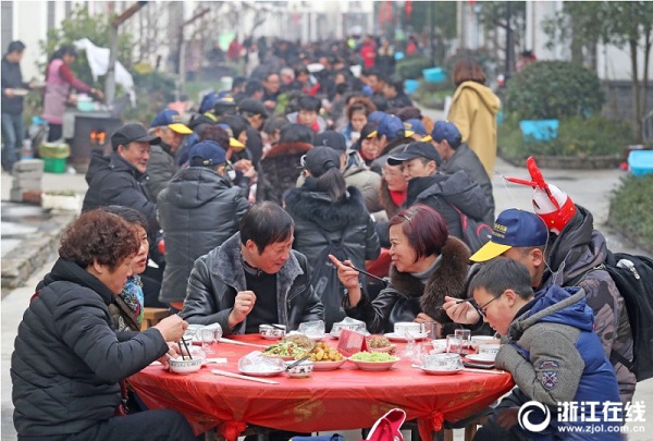Diners enjoy the local cuisine at the rural cultural festival in Jiande, a county-level city in Hangzhou, Zhejiang province on Jan 13. It is hoped that the festival can give a boost to rural tourism in local area. [Photo/zjol.com.cn]