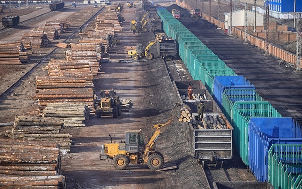 Workers load logs at Manzhouli Railway Port in Manzhouli, Jan 13, 2019. [Photo by Cai Yang/Xinhua]