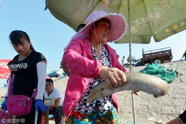 A local seafood vendor holds a sand eel. [Photo/VCG]