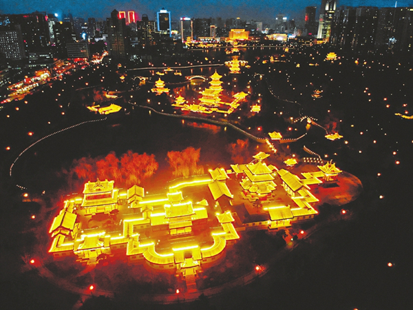 Yingze Park illuminated in bright golden light in Taiyuan, Shanxi province, Jan 17. To welcome the Chinese New Year, Taiyuan launched a special program to make its public areas more attractive for the upcoming public holiday. Major parks in the city such as Yingze, Wenying and Longtan have installed energy-saving lights to brighten the dark nights and make the city look pleasant for visitors. [Photo/Shanxi Daily]