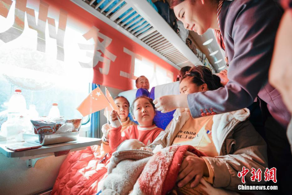A train staff member interacts with children on the K111 on Jan 22, 2019. [Photo/Chinanews.com]