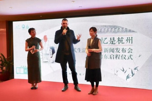 Tim Clancy (middle), an Australian national who has lived in Hangzhou for six years at the news conference of the program "Hangzhou house in LA" in Hangzhou, Zhejiang province [Photo/zjol.com.cn]