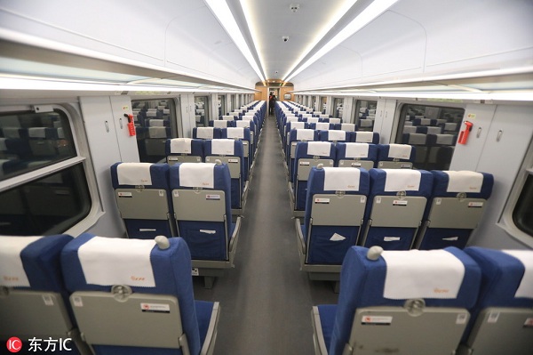 An inside look at the seat carriage of the newly built Fuxing bullet train Hangzhou, the capital of East China's Zhejiang province, on Jan 23, 2019. [Photo/IC]