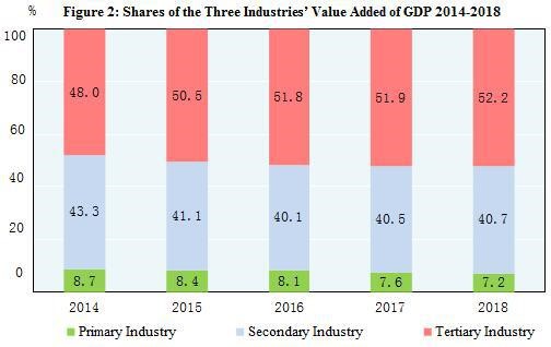 On Nov 22, 2019, the National Bureau of Statistics (NBS) released revised GDP data for 2018. The main results are as follows: the gross domestic product (GDP) in 2018 was 91928.1 billion yuan, an increase of 1.89 trillion yuan from the preliminary accounting, an increase of 2.1 percent. Of this total, the value-added of the primary industryis 6474.5 billion yuan, accounting for 7.0 percent; the added value of the second industry is 36483.5 billion yuan, accounting for 39.7 percent; the added value of the tertiary industry is 48.97 trillion yuan, accounting for 53.3 percent.
