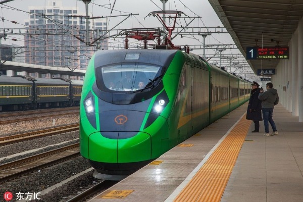 A CR200J green Fuxing bullet train with a speed of 160 km per hour arrives at the Xushui Railway Station in the new special economic zone Xiongan New Area, in Baoding city, north China's Hebei province, Feb 24, 2019. [Photo/IC]