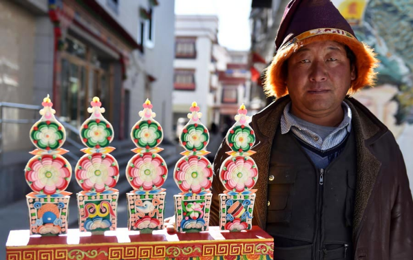 A vendor sells butter figurines in Lhasa, Tibet, on Jan 22, 2019. As Losar, or Tibetan New Year, draws near, people in Lhasa get busy with their annual shopping. Art made of butter, mouthwatering pastries, colorful home decorations all symbolize new hope for an auspicious new year. [Photo/Xinhua]
