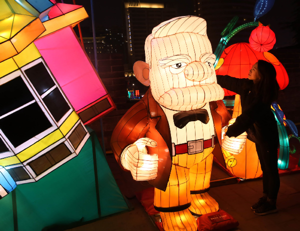 A visitor touches a cartoon character lantern at the 32nd Xi'an City Wall Lantern Festival, Jan 28, 2019. [Photo by Huo Yan/chinadaily.com.cn]