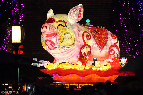 A pig-themed lantern appears at the 33rd Qinhuai Lantern Festival in Nanjing, East China's Jiangsu province, Jan 28, 2019. [Photo/VCG]