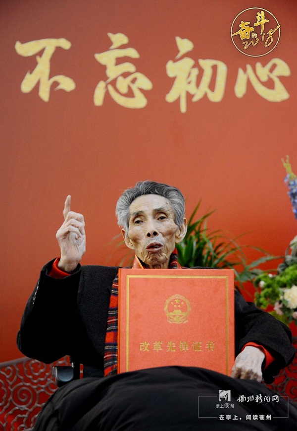 As a cultivator of Yiwu Small Commodity Market, Quzhou native Xie Gaohua is awarded for his great contributions to China's reform and opening-up over the past 4 decades in Beijing on Dec 18. [Photo/qz96811.com]