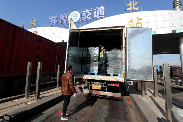 A vegetable transporter's vehicle undergoes inspection before entering Beijing. [Photo by WANG JING/CHINA DAILY]