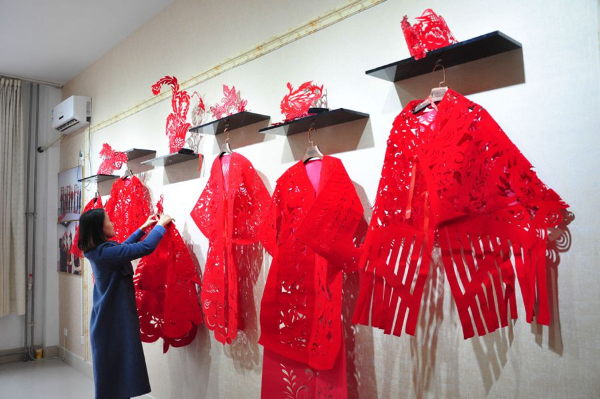 Craftswoman Liang Ying arranges her paper-cutting works of cheongsam at her studio in Liaocheng, East China's Shandong province, Jan 30, 2019. Liang Ying made 18 paper-cutting works of cheongsam to greet the upcoming Spring Festival, which falls on Feb 5 this year. [Photo/Xinhua]