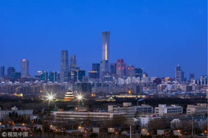 The CITIC Tower, the tallest skyscraper in Beijing, stands far against the Hall of Prayer for Good Harvest, an iconic building in the ancient Temple of Heaven, Jan 25, 2019. [Photo/VCG]