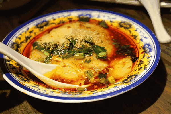 Jiaotuan, or stirred dough, is a dish typical to rural areas of Northwestern China. It is made of flour and looks like white jade, and it becomes transparent and glossy when fully stirred. The delicacy is seasoned with spicy red oil, vinegar, coriander and shallot, and it pleases the eyes, nose and palate of the eaters.